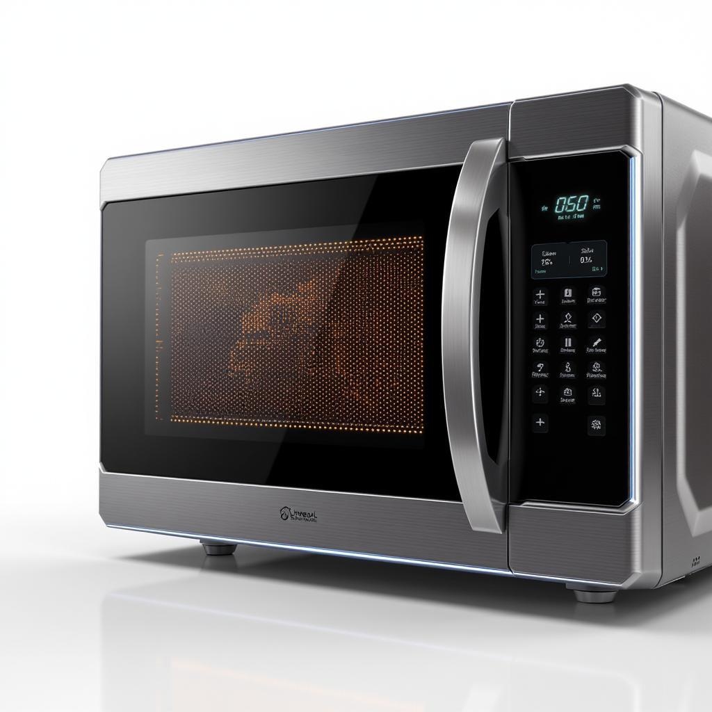 Futuristic microwave featuring a sleek and modern design with a metallic finish, equipped with advanced computing capabilities. The appliance showcases a small, high-resolution touch screen displaying dynamic interfaces. Rendered in digital art style, similar to works on ArtStation, the image is hyper-detailed and hyper-realistic. Set against a pristine white background, created using Unreal Engine technology, the image is rendered in PNG 8K. The microwave is presented with a depth of field effect, highlighting its innovative features and textures. Slight creative modifications include subtle integrated LED lighting accents and a minimalist logo design for aesthetic balance.