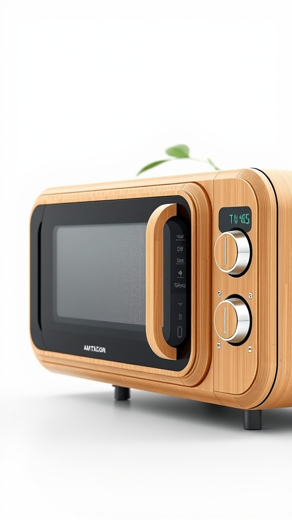 Futuristic microwave modern made of bamboo sustainable design intricately detailed artstation style digital art hyper realistic white background unreal engine png 8K subtle depth of field --ar 1:1 with innovative touch controls and sleek curved edges showcasing a seamless blend of technology and nature.