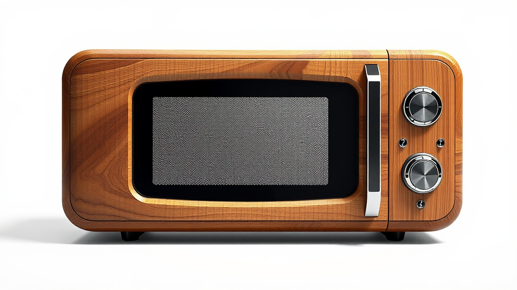 Futuristic microwave with a modern aesthetic, crafted from sustainable wood, featuring an elegant and eco-friendly design; hyper-detailed and hyper-realistic, capturing the essence of artstation style in digital art. Set against a white background in an 8K PNG using Unreal Engine, with an emphasis on depth of field, showcasing intricate textures and innovative features; a blend of natural and high-tech elements, --ar 1:1 ratio.