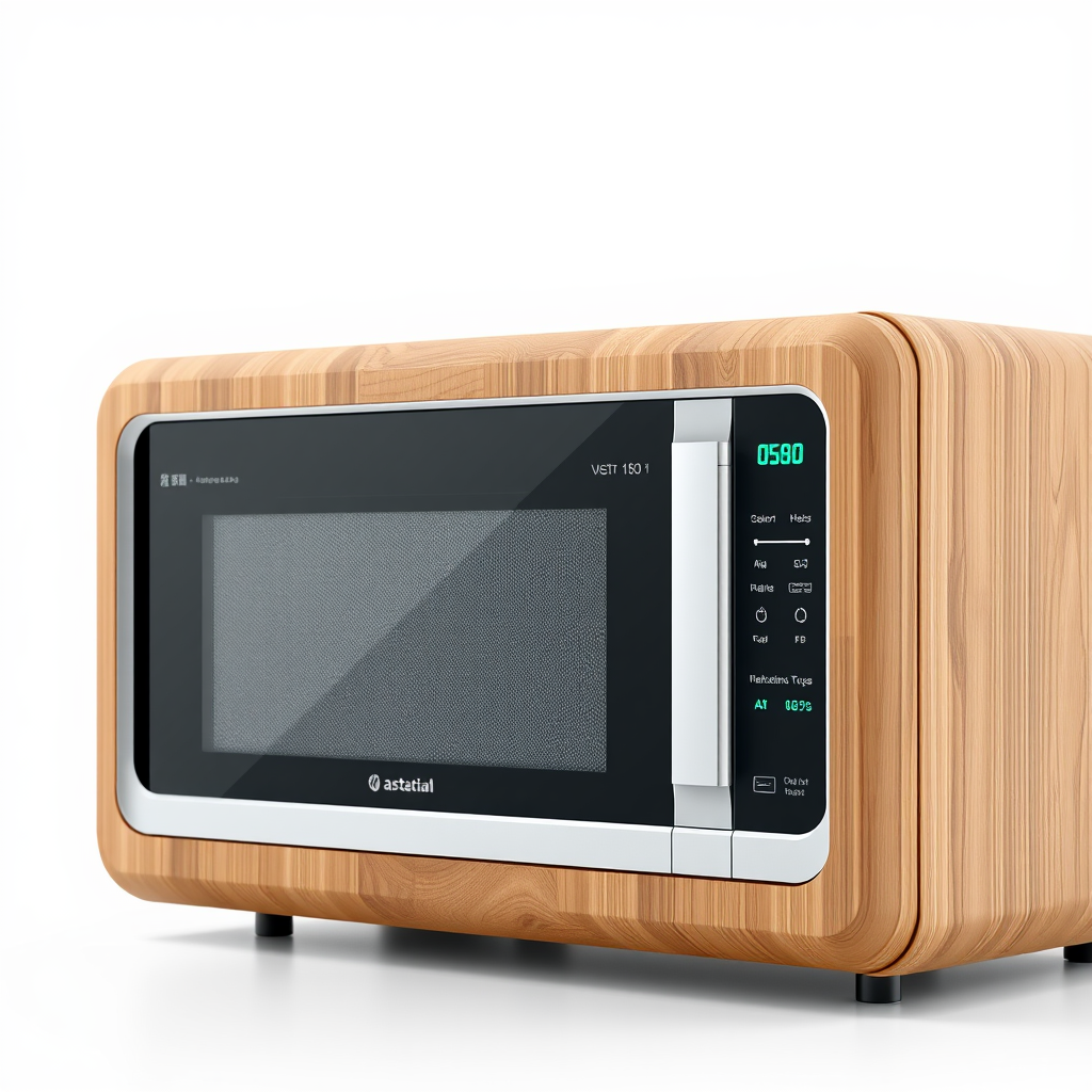 Futuristic microwave with a sleek, modern design crafted from sustainable wood, featuring advanced digital interfaces and touch controls, hyper detailed and hyper realistic rendering in the style of ArtStation, set against a white background with depth of field effects, capturing an ultra-modern aesthetic in Unreal Engine, high resolution PNG 8K, maintaining a balance between innovative technology and natural materials.