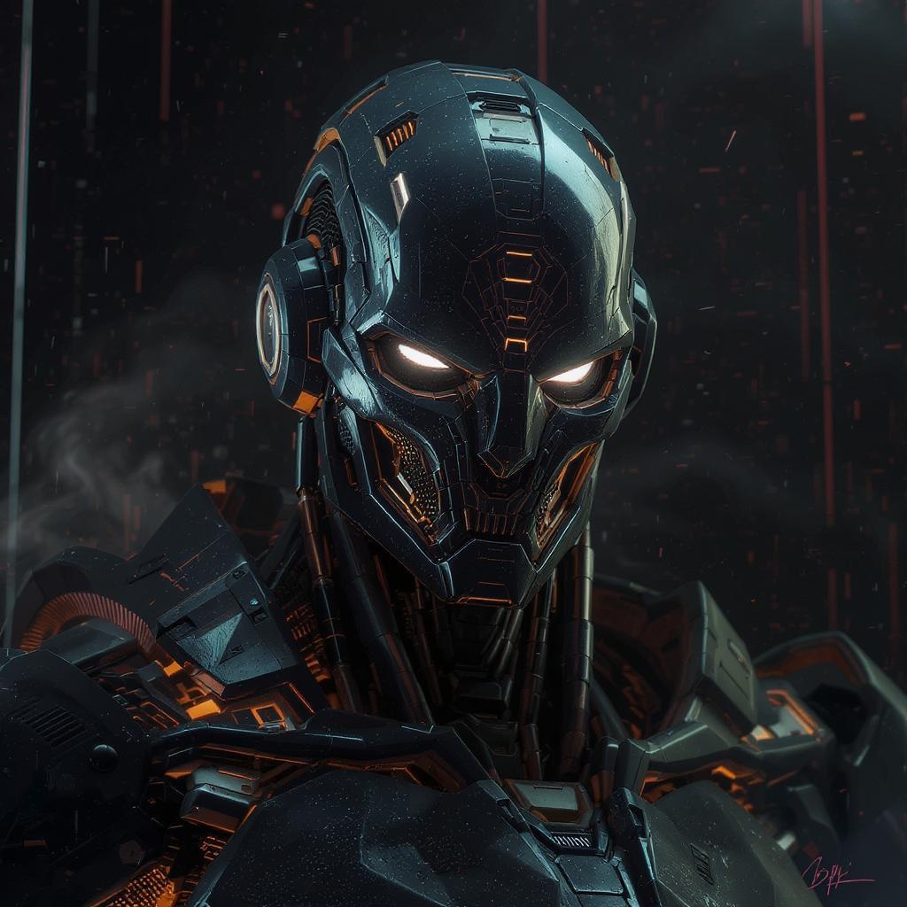 Futuristic military cyberpunk robot design featuring a stealthy, glowing presence and a highly detailed, smooth, and intricate face with symmetrical elements. The character is set in a dynamic scene with real-time VFX and volumetric lighting, enhanced by ambient light for depth. The design combines elements of digital 3D crafting with UHD and HDR cartoon touches, inspired by anime and digital painting. The character is a cyborg, blending human and abstract metal sculpture aesthetics, featuring asymmetrical features and geometric patterns. The presence of purposeful openings and an expressive mouth adds to the intrigue. The overall design embraces unique and abstract proportions, evoking a sense of otherworldliness while maintaining elegance and symmetry. Subtle digital brushes hint at artistic influence without any overt signatures or text marks.