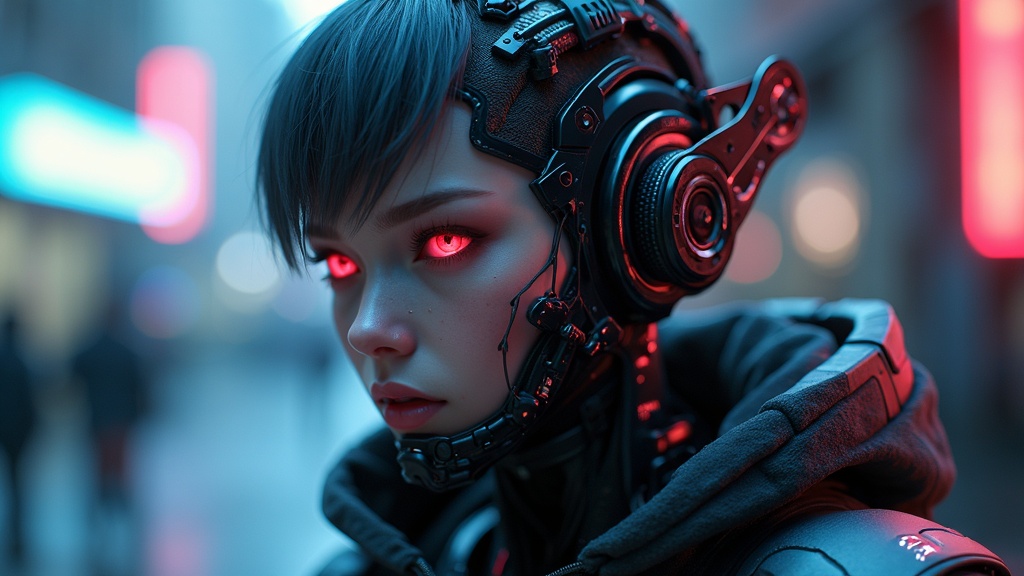 futuristic military cyborg in a dreamlike 3d render, cyberpunk style with elements of warframe, featuring stealthy, armored design. Accentuated with neon lights, the character design showcases hard surface architecture with smooth and highly detailed features. The face is intricately detailed, maintaining symmetry, and enhanced by volumetric and ambient lighting. The visual scene captures real-time effects with a focus on vfx, rendered in digital 3d with uhd and hdr qualities. Pay attention to facial features like mouth and ears, while avoiding defects such as bad proportions or deformed anatomy. Keep the depiction free from undesirable effects like cartoonish or anime styles, ensuring clarity, balance, and aesthetic appeal in the digital painting.