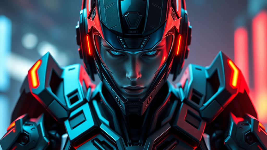 Futuristic military cyborg in a cyberpunk world, featuring sleek warframe-inspired armor with a focus on stealth and agility. The design incorporates neon lights highlighting the intricate, symmetrical hard surfaces of the suit. The character's face is smooth and detailed, with precise anatomical features illuminated by volumetric and ambient lighting, giving a real-time feel. VFX elements enhance the digital 3D environment, presenting an ultra-high-definition, HDR atmosphere. Avoiding common pitfalls of character design, the cyborg's proportions are balanced and realistic, exuding an aura of sophistication and power while staying true to the essence of highly detailed, symmetrical, and futuristic aesthetics.
