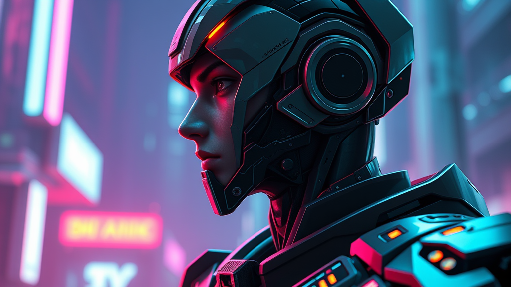 Futuristic military cyborg in a dreamlike cyberpunk setting, digital art featuring a detailed and sleek anime-style portrait, showcasing a warframe-inspired armored figure with neon lights illuminating the scene. The character design emphasizes hard surface elements with a smooth, intricately detailed face, capturing symmetrical and volumetric lighting. Ambient light enhances the real-time VFX feel of the digital 3D environment. The side profile showcases unique details without distortion, such as elongated necks or deformed anatomy, maintaining balanced proportions. This uhd hdr depiction avoids any blurred or cropped elements, ensuring clarity and finesse in every aspect.