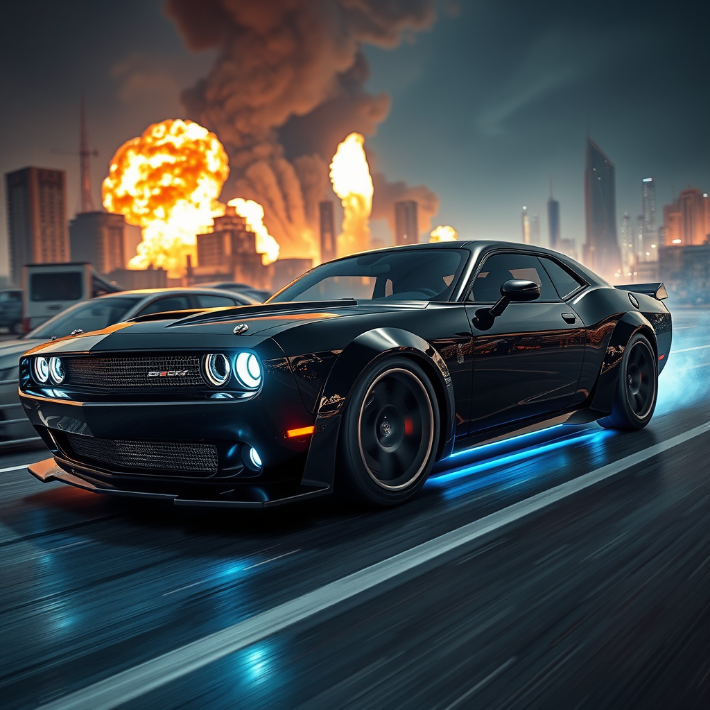 Futuristic muscle car with a hyper-realistic design, sleek aluminum body adorned with glossy black paint, intense bright headlights cutting through the scene, captured in high resolution. The car exudes a sense of speed, set against a backdrop of a city in ruins, with dramatic explosions illuminating the night sky. The ultra-detailed image captures ray-traced reflections and shimmering specular lights across the car's surface, enhancing its dynamic presence. The view provides a dynamic side angle, showcasing the car in motion, while electric-blue underglow lights add a fresh twist to its futuristic appearance.
