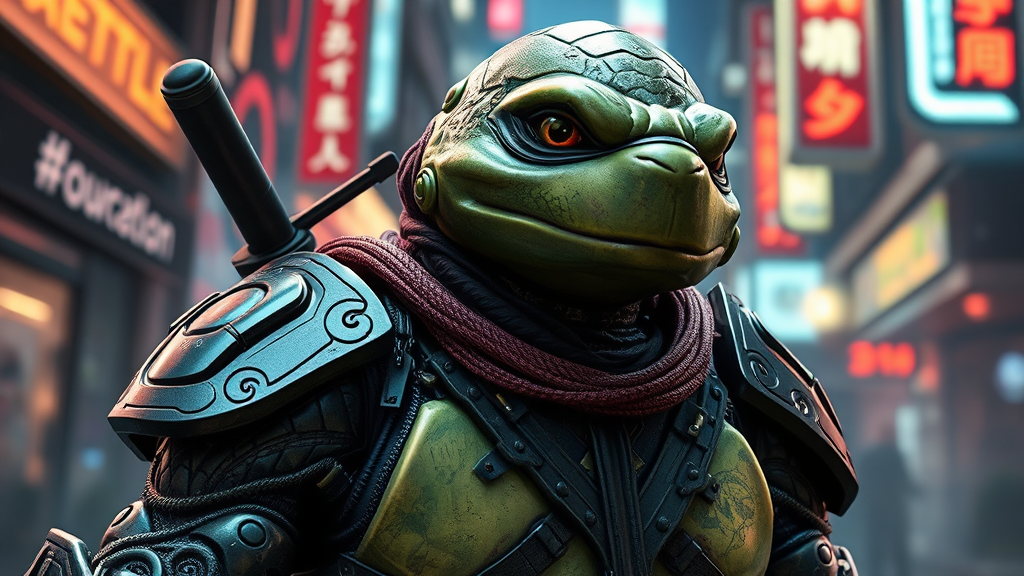 Futuristic ninja turtle warrior, intricately designed, 8K hyper-realistic, showcasing hyper-detailed micro-structures, amazing textures, and highly realistic features. Set in a neon-lit urban landscape with shadows and reflections enhancing the realistic feel. The turtle's armor gleams with intricate patterns, and every surface reveals insane attention to detail, capturing the essence of a formidable, stealthy guardian in an ultra-modern environment.