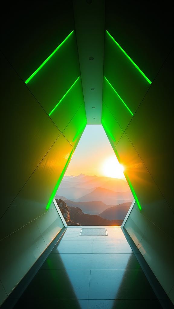 Futuristic passageway, illuminated with neon green hues, angular white surfaces, panoramic mountain vistas through framed openings, silhouetted by a setting sun, interplay of contrasting light and shadow, architectural photography with a sci-fi feel, striking viewpoint, serene blue mountains in the background.