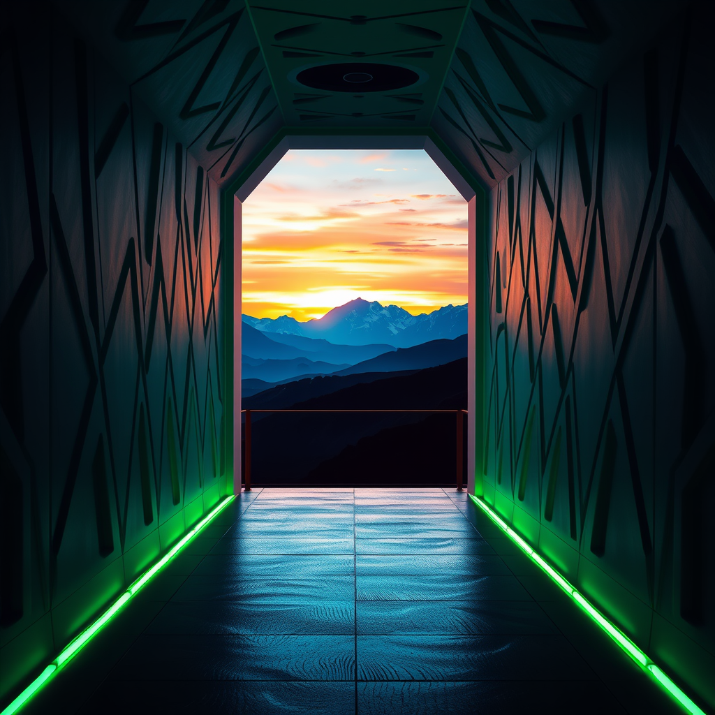 Futuristic passageway with neon green lighting, intricate geometric white walls, a panoramic view of a mountain range at sunset, creating silhouettes. An interplay of contrasting light and shadow casts dynamic patterns, capturing the essence of architectural photography. The scene exudes a sci-fi atmosphere with a dramatic perspective, highlighting the cool blue hues of the mountains against the vibrant sky.