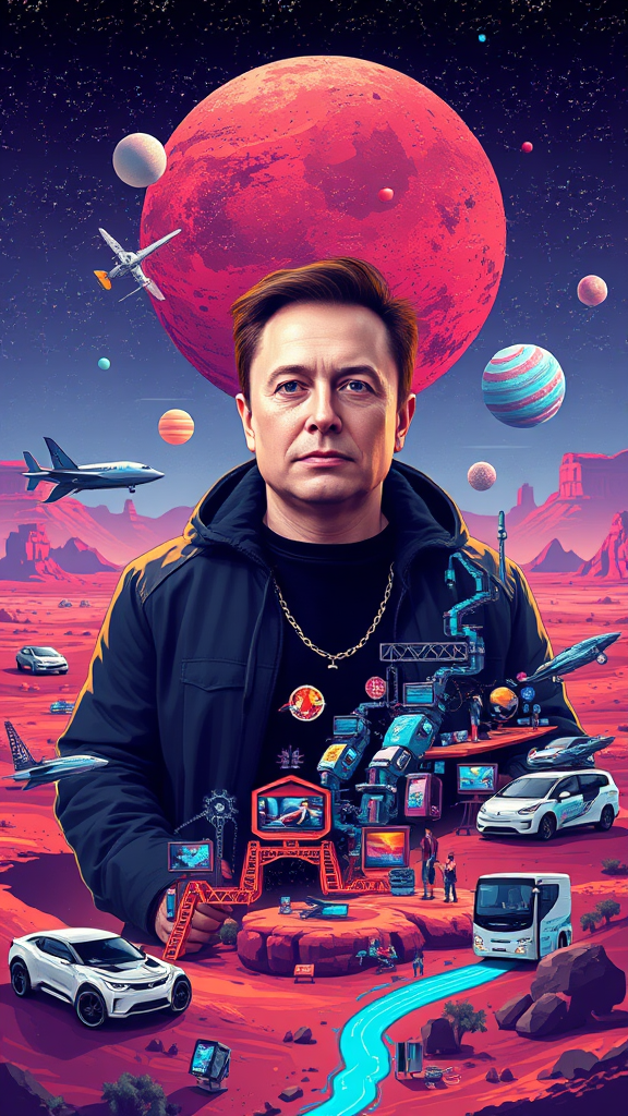 Futuristic pixel art scene featuring Elon Musk as a visionary pioneer, surrounded by a vibrant mosaic of space exploration, electric vehicles, and AI innovations, set against a backdrop of a digitally stylized Mars landscape with pixelated starry skies.