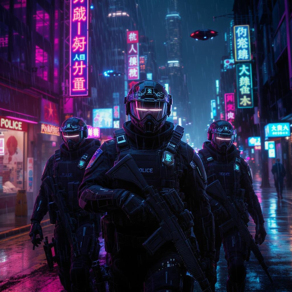 View this AI-generated image featuring futuristic police officers patrolling neon drenched streets in a cyberpunk metropolis clad in sleek advanced riot gear with intricate detailing their helmets featuring augmented reality interfaces reflect the vibrant hues of the city lights the scene is bathed