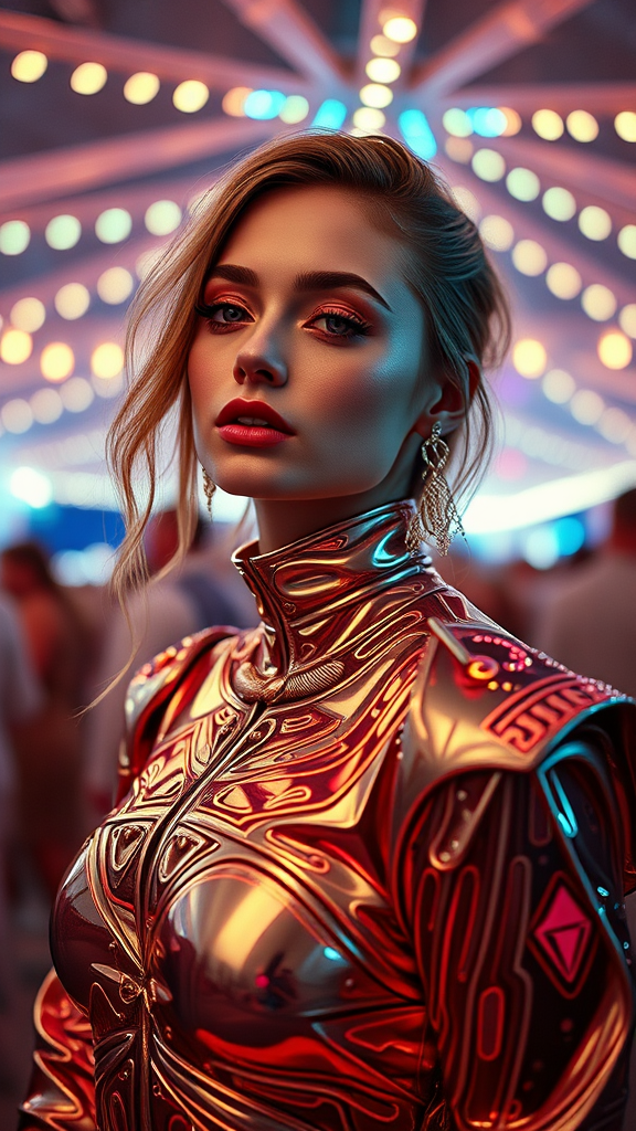 Futuristic portrait of a woman at a cosmic carnival, hyperrealistic, rendered in octane, vibrant ProPhoto RGB, dreamscape engine, shot with 35mm lens, Ultra HD! lifelike and stunning! inspired by Balenciaga fashion magazine shoot, avant-garde style, captivating beauty with a celestial aura, elegant pose, metallic ensemble, otherworldly backdrop, reminiscent of 90's editorial vibe, captured in medium format, Fuji Pro 400H, ISO 400, cinematic and ethereal, surrealistic, 8k.