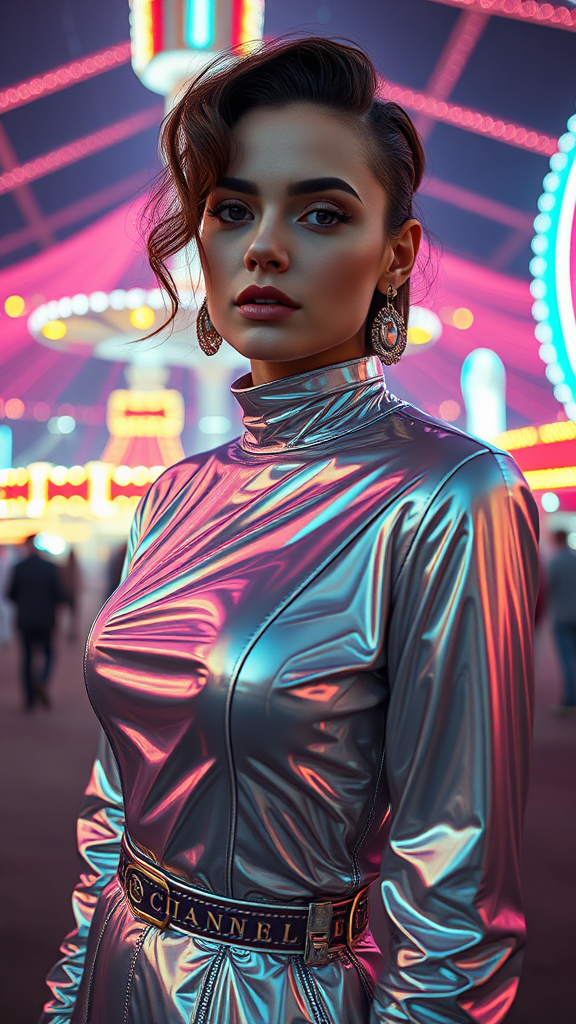 Futuristic portrait of a woman at the cosmic circus, hyperrealistic CGI, octane render, vivid ProPhoto RGB, surreal ambiance, 35mm ultra HD, realistic! Chanel fashion magazine photoshoot, avant-garde fashion, striking features, female posing elegantly, metallic outfit, dreamlike landscape, vintage 90's fashion vibe, medium format, Kodak Portra 400, iso 400, cinematic, surrealistic, 8k.