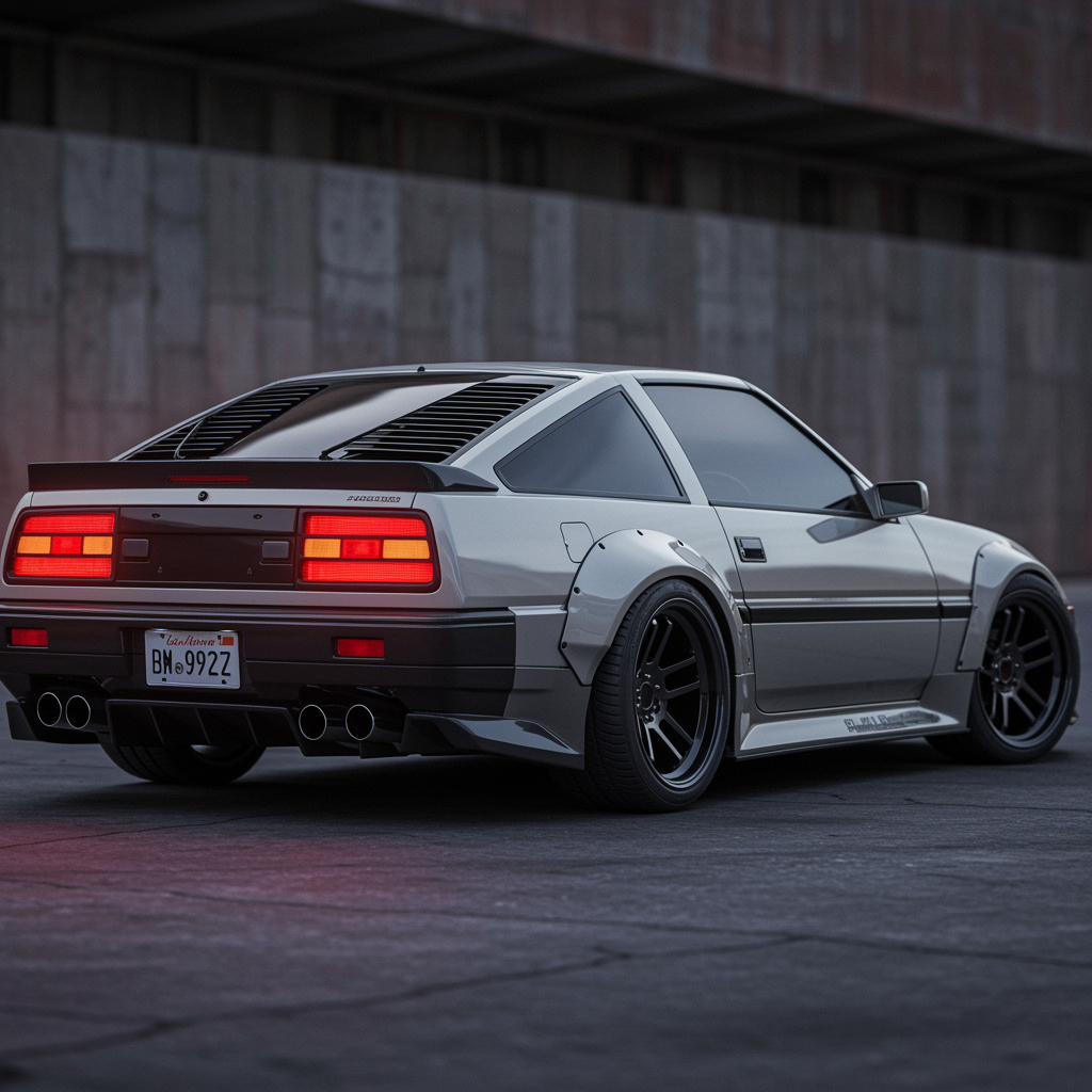Futuristic reimagining of a 1984 Nissan 300zx featuring an aggressive wide body design with aerodynamic vents, sleek custom LED tail lights integrated into the rear, and subtle carbon fiber detailing throughout. Captured using a Canon D500 in a raw, high-resolution format resembling the texture and color warmth of Portra 200 film, while showcasing modern touches like digital side mirrors and a lowered stance for added dynamism.