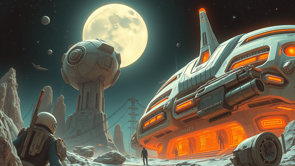 Futuristic scene by roblunda mccallum, featuring intricate details in a blink-and-you-miss-it style, a dynamic full body composition, contrasting shades of moonlit white and glowing orange, combining sci-fi realism with vintage pulp comics aesthetic, rendered in a smooth airbrush technique reminiscent of classic comic art, evoking a sense of vibrant mystery and adventure, aspect ratio 31:64, uniquely stylized to enhance depth and nuance.