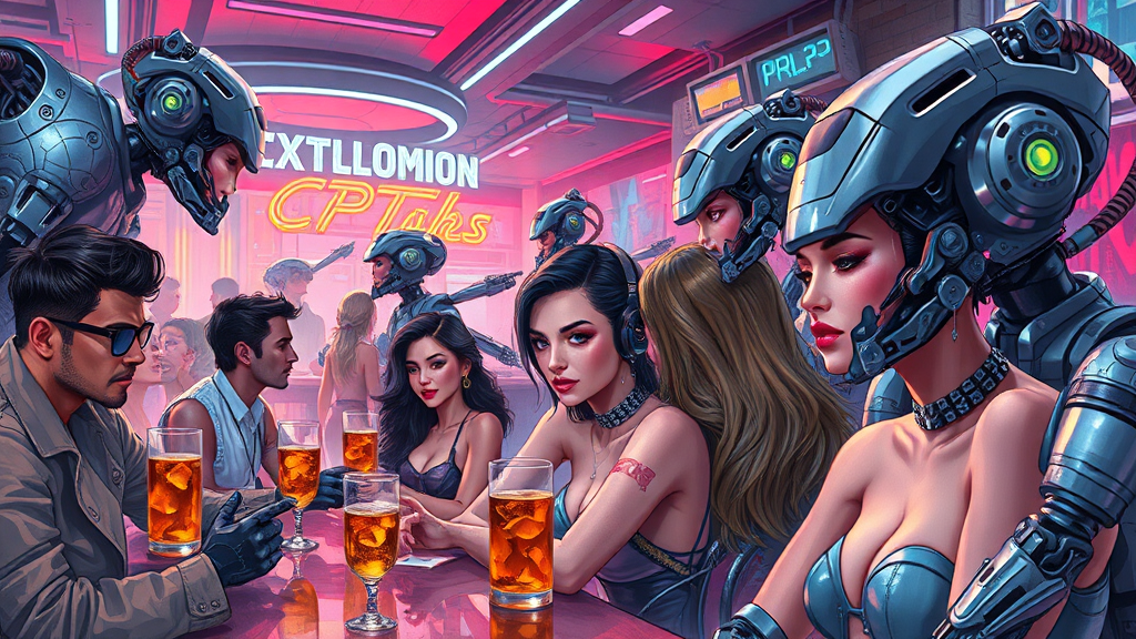 Futuristic scene depicting a diverse group of people enjoying drinks in a sleek, neon-lit bar surrounded by intricately detailed sci-fi robotic cyborgs featuring complex mechanical designs. The hyper-realistic and cinematic composition captures the essence of a bustling futuristic social hub, inspired by the styles of Federico Pelat and Jan Urschel. This artstation HQ-quality illustration blends drawing and painting techniques with subtle cel-shading. The human characters are adorned with bold makeup and vibrant lipstick, adding a touch of modern fashion flair to the dynamic and immersive setting.