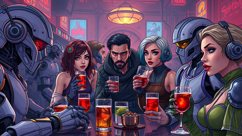 Futuristic scene of diverse sci-fi characters enjoying drinks in an atmospheric bar, surrounded by highly detailed robotic cyborgs with intricate mechanical designs, rendered in hyper-realistic, cinematic style. Composition evokes the art of Federico Pelat and Jan Urschel, embodying ArtStation HQ quality with elements of drawing and painting, featuring cel-shading techniques. Subtle tweaks in makeup and lipstick enhance the vibrant and dynamic setting, reminiscent of works by Bimi, showcasing expressive and imaginative artistry in a lively intergalactic social hub.