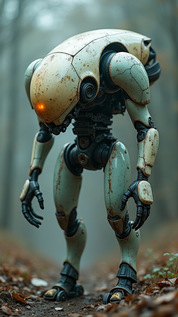 View this AI-generated image featuring futuristic sci fi drone robot with an intense cinematic presence featuring a distorted and mutated design its whole body exudes an ugly yet fascinating aesthetic with deformed and abstract elements reminiscent of a poorly drawn cathedral the scene is enveloped