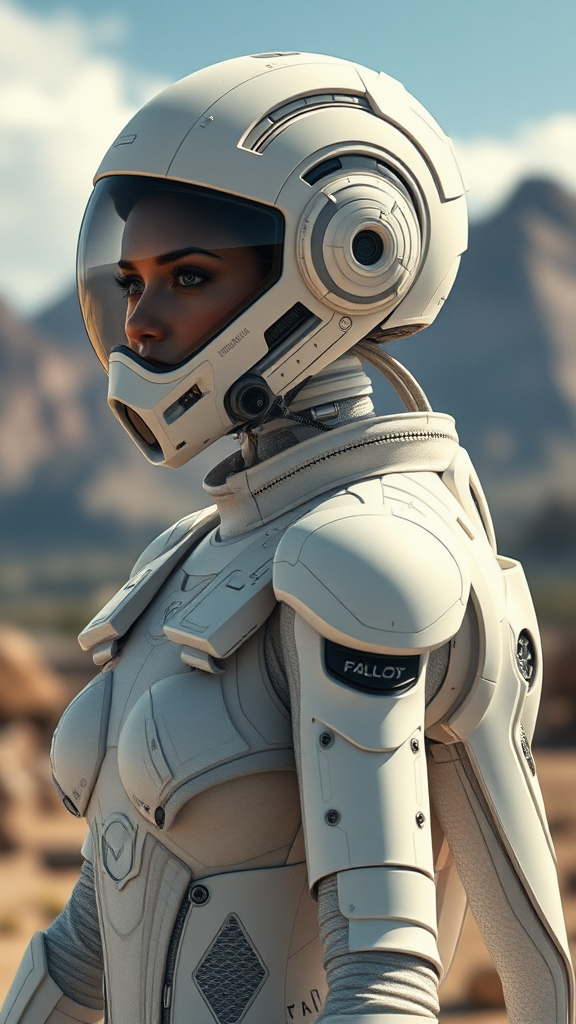 Futuristic sci-fi female armor in ivory hue, featuring a cybernetic helmet seamlessly integrated with insulated full-body spacesuit layers, revealing a bald head design for precision interface; extensive intricate detailing reminiscent of high-end sci-fi cinema design. The scene captures a third-person view in photorealistic outdoor setting, employing natural lighting with an emphasis on cinematic rendering. Utilizing ray tracing for impeccable clarity, the armor reflects a blend of sleek technology and elegance, ensuring the highest quality and detail in every frame.