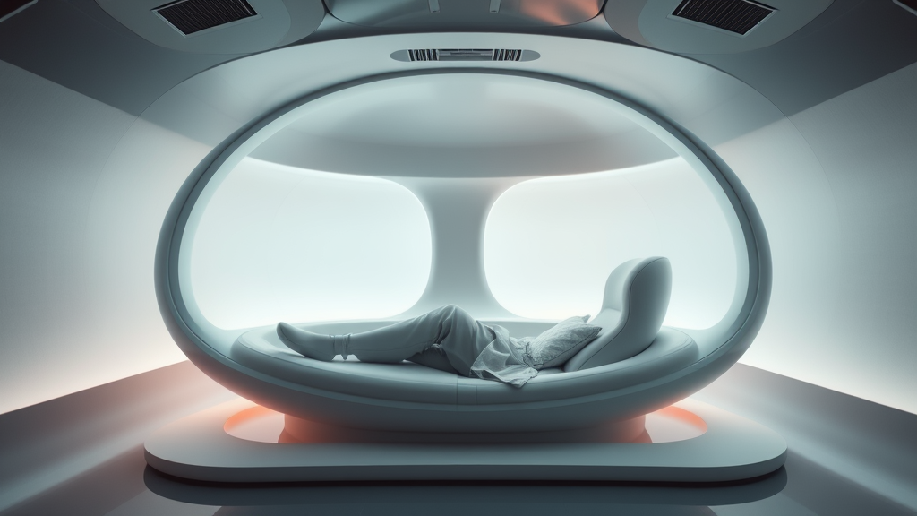 Futuristic sci-fi lounging pod, sleek and minimalist design, seamless curves, soft ambient lighting, innovative materials, editorial photographic angle, showcasing a modern and cozy interior, vibrant yet subtle color palette, product-view emphasis, blending technology and comfort.
