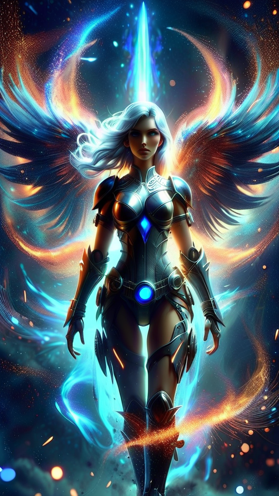 Futuristic Sci-Fi meets mythology and spirituality. Battle goddess, goddess of vengence and retribution. Avenging Angel, God's favorite destroyer of evil, demon killer, galactic traveller, space goddess. Her avatar is that of an otherworldly being; she is tall, strong, athletic, statuesque. Her skin is the color and fabric of the universe, you can see stars and galaxies within her physicality. Her eyes are two new-born stars, shining brightly. Her hair is jet-black medium length and spiky, swept back on the sides, also reflecting the universe. Chrome pauldrons on her shoulders with white gems lit up from within. Chrome bracers on her arms, chrome breastplate with glowing white glyphs, chrome tech belt on her waist with glowing blue stone at the center. Chrome shorts/ short pteruges, chrome thigh guards. Chrome knee-high boots with heels, glowing white glyphs within the boots. She has six huge flaming wings of fire like a seraphim, composed of bright blue flames. She carries a gigantic flaming blue sword of light and fire. She has more than enough power and glory to destroy whatever evil confronts her. When The Creator sets her to a task, she does not stop until it's completed or The Creator calls her off. Full body pose, in space defending a galaxy, the stars reflected off her chrome outfit. {{{6 flaming wings of bright blue fire}}} {{{MASTERPIECE}}}