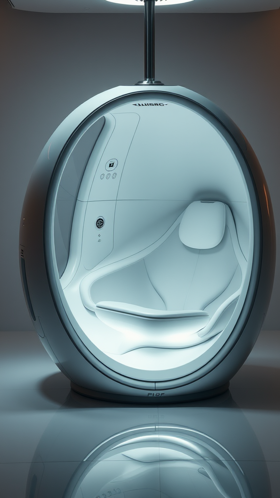 Futuristic sci-fi pod lounge chair, sleek minimalist design, futuristic materials with a touch of elegance, showcasing cutting-edge technology, editorial photography style, soft ambient lighting, innovative ergonomics, harmonious blend of form and function, visually captivating product view.