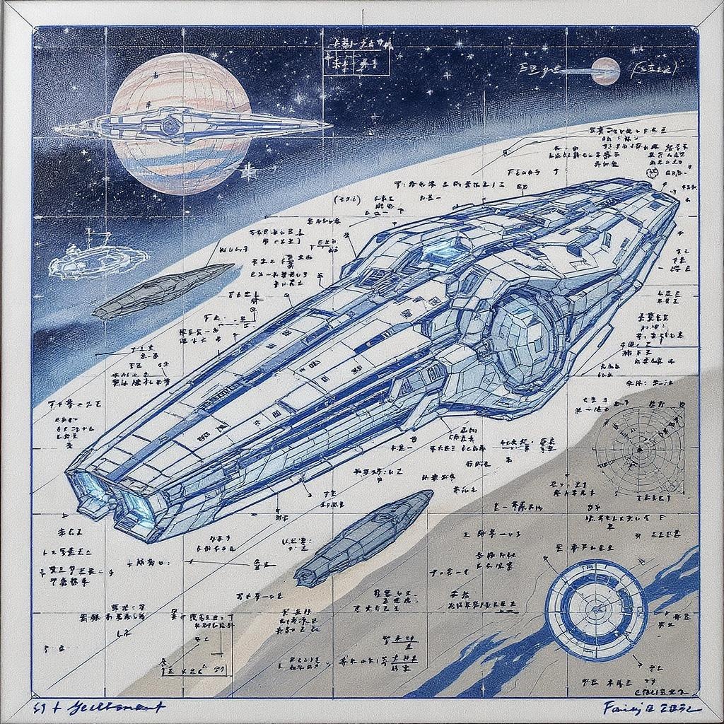 Futuristic sci-fi spacecraft sketch featuring intricate blueprint designs and warp engine schematics with detailed formulas and annotations. Each component is methodically segmented, adhering to the principles of the golden ratio, interspersed with fictitious yet intriguing details. The composition is inspired by the trending styles on pixiv fanbox, utilizing an acrylic palette knife technique to give it texture and depth. The visual narrative weaves the ethereal storytelling style of Makoto Shinkai and Studio Ghibli, the vivid world-building of Genshin Impact, and the whimsical charm of James Gilleard, Greg Rutkowski, and Chiho Aoshima, creating a tapestry of futuristic imagination.