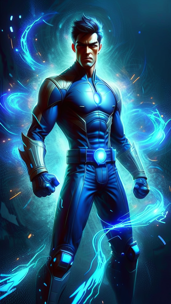 Futuristic Sci-Fi super-hero. Telepath, mind warrior. He can create a bright blue energy blade from either of his hands, and can make this energy shrink or expand by will. This energy blade can do mind damage as well as physical damage, a shock to his opponent's neurosystem or electroshock to their body. He also has an ability to defy gravity and walk/run among the walls and ceiling. He can dodge bullets or anything else projected at him. Tall, thin, lithe but muscular, sinewy, well defind. Masculine Caucasian male. Thin but handsome face with dark eyes, chiseled jaw and strong brow. Smooth, hairless face. Straight dark brown hair, fade hairstyle cut close on sides and back, longer on top with middle parted bangs falling over his eyes. He usually wears a pair of dark sunglasses to hide the bluish glow from his eyes. Cobalt blue spandex suit with silver glyphs and circuitry patterns down the arms, legs and chest. A dark blue tech belt around his waist, dark blue knee-high boots, and a large flowing dark blue trenchcoat, open to reveal his uniform. Full body pose, energy blade extended from his fist and glowing bright blue.