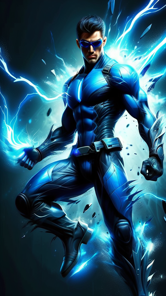Futuristic Sci-Fi super-hero. Telepath, mind warrior. He can create a bright blue energy blade from either of his hands, and can make this energy shrink or expand by will. This energy blade can do mind damage as well as physical damage, a shock to his opponent's neurosystem or electroshock to their body. He also has an ability to defy gravity and walk/run among the walls and ceiling. He can dodge bullets or anything else projected at him. Tall, thin, lithe but muscular, sinewy, well defind. Masculine Caucasian male. Thin but handsome face with dark eyes, chiseled jaw and strong brow. Smooth, hairless face. Straight dark brown hair, fade hairstyle cut close on sides and back, longer on top with middle parted bangs falling over his eyes. He usually wears a pair of dark sunglasses to hide the bluish glow from his eyes. Cobalt blue spandex suit with silver glyphs and circuitry patterns down the arms, legs and chest. A dark blue tech belt around his waist, dark blue knee-high boots, and a large flowing dark blue trenchcoat, open to reveal his uniform. Full body pose, energy blade extended from his fist and glowing bright blue.