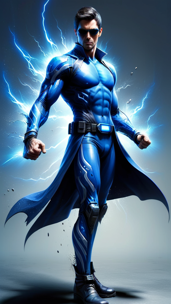 Futuristic Sci-Fi super-hero. Telepath, mind warrior. He can create a bright blue energy blade from either of his hands, and can make this energy shrink or expand by will. This energy blade can do mind damage as well as physical damage, a shock to his opponent's neurosystem or electroshock to their body. He also has an ability to defy gravity and walk/run among the walls and ceiling. He can dodge bullets or anything else projected at him. Tall, thin, lithe but muscular, sinewy, well defind. Masculine Caucasian male. Thin but handsome face with dark eyes, chiseled jaw and strong brow. Smooth, hairless face. Straight dark brown hair, fade hairstyle cut close on sides and back, longer on top with middle parted bangs falling over his eyes. He usually wears a pair of dark sunglasses to hide the bluish glow from his eyes. Cobalt blue spandex suit with silver glyphs and circuitry patterns down the arms, legs and chest. A dark blue tech belt around his waist, dark blue knee-high boots, and a large flowing dark blue trenchcoat, open to reveal his uniform. Full body pose, energy blade extended from his fist and glowing bright blue.
