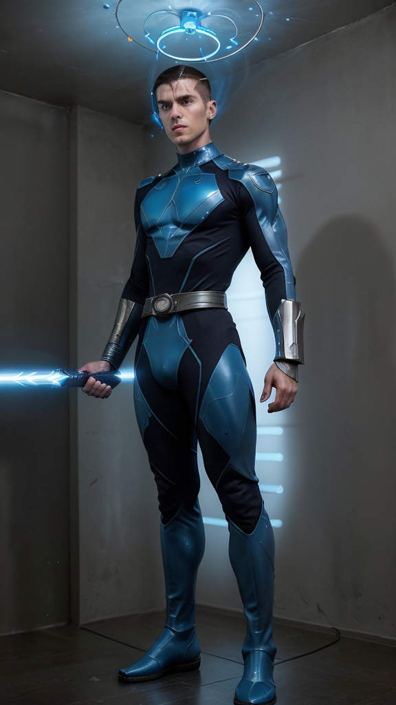 Futuristic Sci-Fi super-hero. Telepath, mind warrior. He can create a bright blue energy blade from either of his hands, and can make this energy shrink or expand by will. This energy blade can do mind damage as well as physical damage, a shock to his opponent's neurosystem or electroshock to their body. He also has an ability to defy gravity and walk/run among the walls and ceiling. He can dodge bullets or anything else projected at him. Tall, thin, lithe but muscular, sinewy, well defind. Masculine Caucasian male. Thin but handsome face with dark eyes, chiseled jaw and strong brow. Smooth, hairless face. Straight dark brown hair, fade hairstyle cut close on sides and back, longer on top with middle parted bangs falling over his eyes. He usually wears a pair of dark sunglasses to hide the bluish glow from his eyes. Cobalt blue spandex suit with silver glyphs and circuitry patterns down the arms, legs and chest. A dark blue tech belt around his waist, dark blue knee-high boots, and a large flowing dark blue trenchcoat, open to reveal his uniform. Full body pose, energy blade extended from his fist and glowing bright blue.