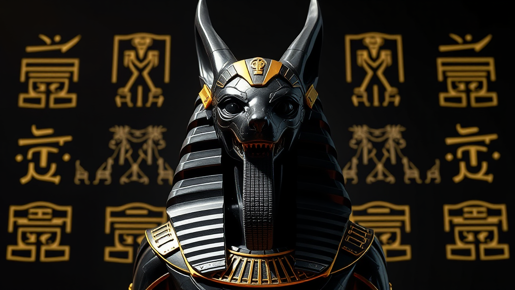 Futuristic sculpture of Anubis, reimagined as the "God of Death" with an avant-garde Egyptian twist. This awe-inspiring monument is intricately designed in polished black granite with gold accents and adorned with modular, sacred hieroglyphs. Set against a dark backdrop, faint Egyptian symbols are projected in light, enhancing the grand and dignified presence of the figure. The portrait shot is centered, capturing laser-cut precision and hyper-detail, merging sci-fi elements with futuristic-avant-Egyptian aesthetics. The piece is void of any modern distractions such as text, signatures, or artifacts, ensuring a focus on quality and artistic mastery.