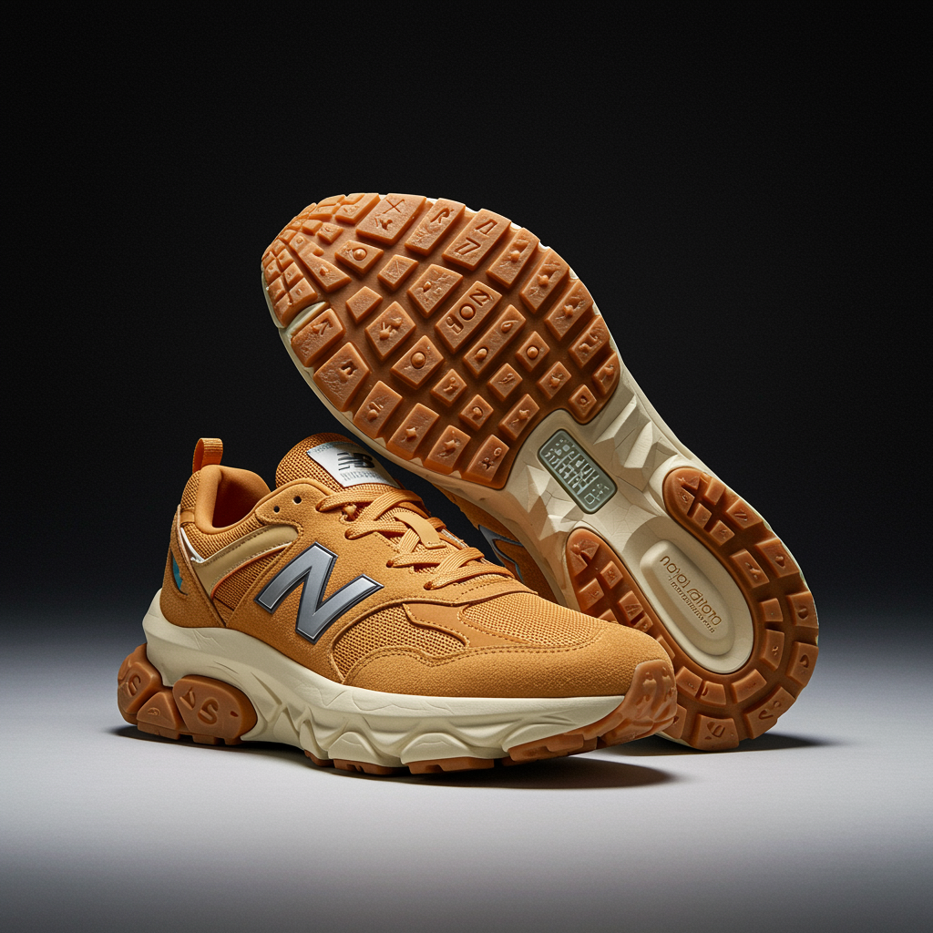 Futuristic shoe concept design by New Balance, integrating cutting-edge nanotechnology, vibrant warm color palette, open and dynamic composition, captured in a detailed photographic style inspired by Thomas Kuoh, emphasizing innovation and sleek aesthetics, --ar 4:5 --chaos 50 --quality 5000 --style strength 1000 --quality 2000 --style strength 750 --version 5