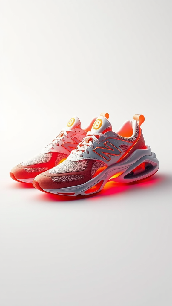 Futuristic shoe concept design, inspired by New Balance, featuring advanced nanotechnology, utilizing a warm and vibrant color palette with an open composition. Photographed in the style of Thomas Kuoh, showcasing sleek, innovative textures and dynamic contours. The shoes exhibit cutting-edge functionality with a harmonious balance of form and technology, set against a clean, minimalist background.