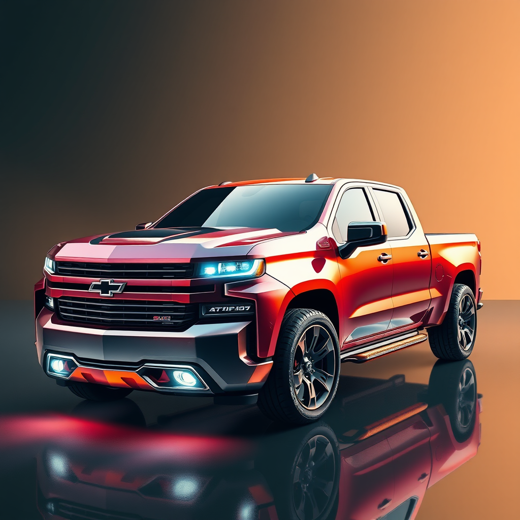 Futuristic Silverado pickup truck concept, infused with steampunk and Cyberpunk 2077 aesthetics, featuring a reimagined, sleek front end, advanced geometric bodylines, and a dynamic metallic color palette, blending vintage industrial elements with cutting-edge technology elements.