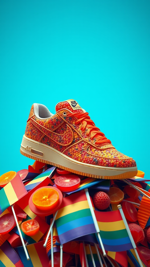 Futuristic solarpunk sneakers inspired by Nike Airs made from vibrant dried fruit textures, featuring high detail and intricate design. Bright colors blend seamlessly into a clean composition, with a 3D render showcasing them proudly atop a pile of Pride flags. The artwork is a breathtaking fusion of nature and technology, highlighting the harmony of sustainability and style.