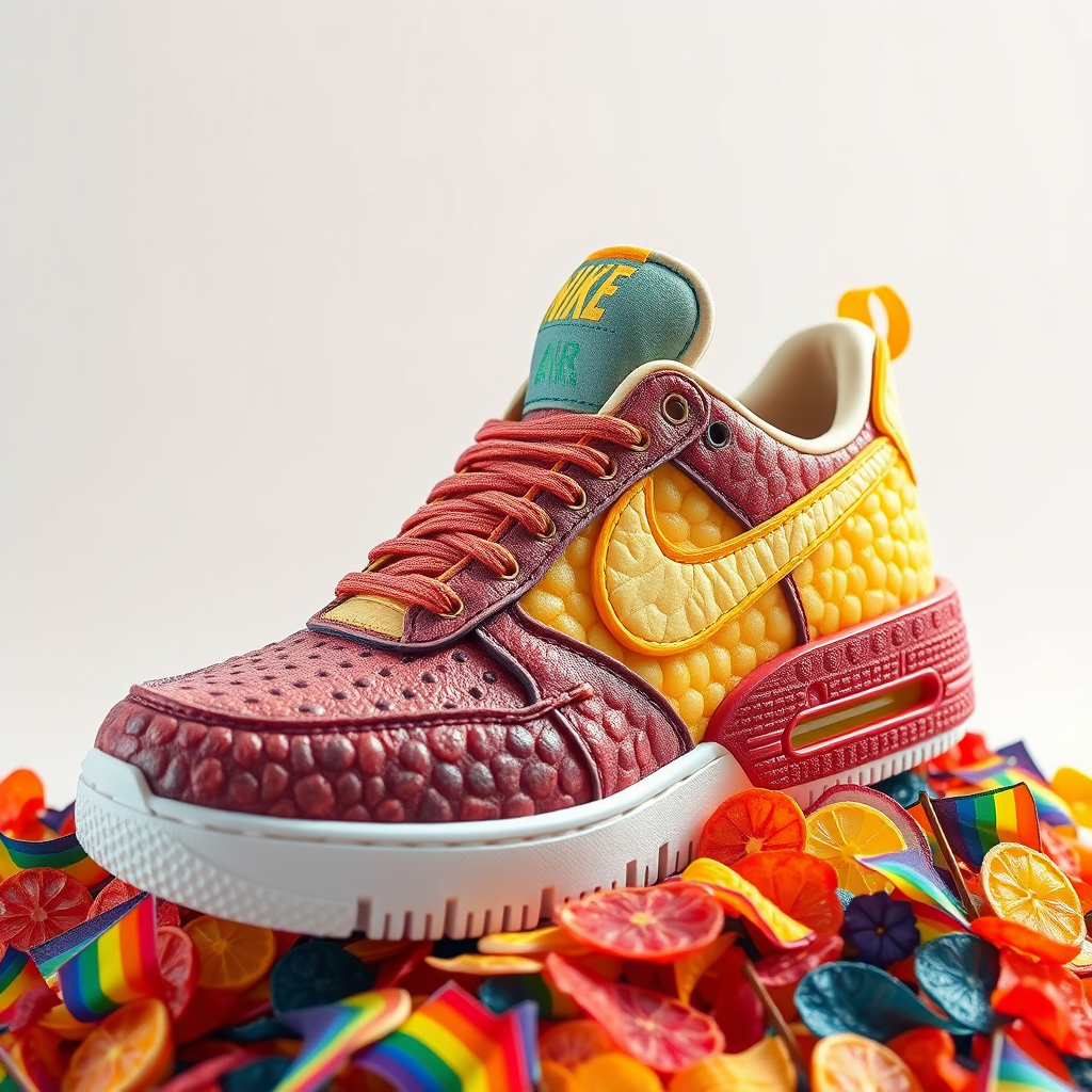 Futuristic solarpunk sneakers inspired by Nike Airs, crafted from an array of vibrant, dried fruits with high detail and intricate patterns. The 3D render showcases bright, vivid colors in a clean composition, where the sneakers elegantly sit atop a mound of colorful Pride flags. This beautiful artwork blends innovation with nature, featuring meticulous detailing that highlights the unique textures of the dried fruit materials.