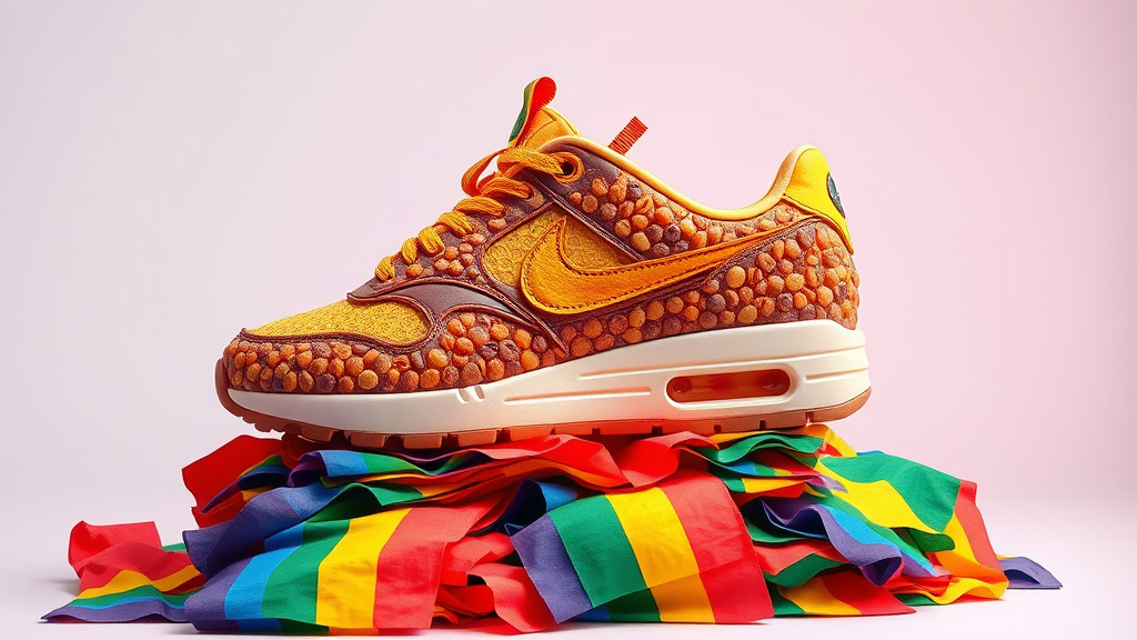 Futuristic solarpunk sneakers inspired by Nike Airs crafted from dried fruit, exhibiting a high level of intricate detail and vibrant colors, set against a clean composition. These 3D rendered sneakers stand elegantly atop a layered pile of colorful Pride flags, creating a visually stunning and innovative piece of artwork.
