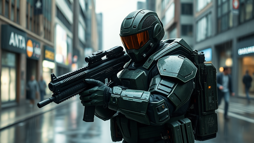 Futuristic soldier clad in advanced dark army green armor, wielding sophisticated weaponry, and wearing a sleek helmet, positioned on a rainy urban street. The scene features intricate armor detailing and a striking reflective surface, enhanced by dramatic overcast lighting. Hyperrealism and photorealistic quality are emphasized, capturing a cinematic essence in ultra-high definition 8k, reminiscent of a scene rendered in a cutting-edge game engine, with subtle creative enhancements to amplify the intensity and realism.