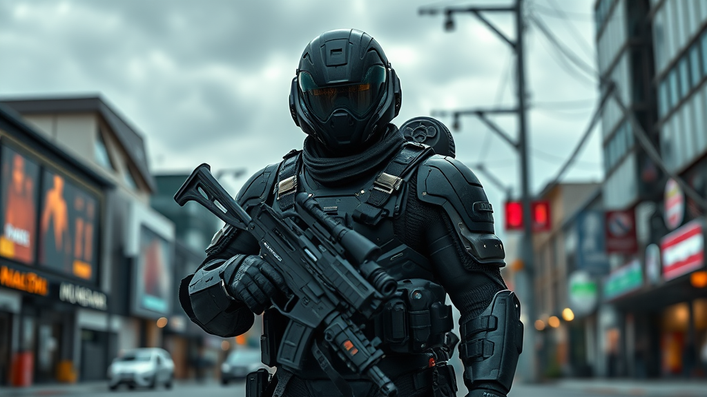 Futuristic soldier in full battle armor equipped with cutting-edge weapons and high-tech accessories, standing on an urban street under an overcast sky. The scene features complex design elements and meticulous details with dramatic lighting effects. A hyperrealistic and photorealistic style enhances the cinematic quality, rendered in ultra-high-definition 8k with extraordinary realism, showcasing detailed reflections and textures similar to a game engine environment. Aspect ratio 9:16, with a touch of organic elements to contrast with the advanced technology.