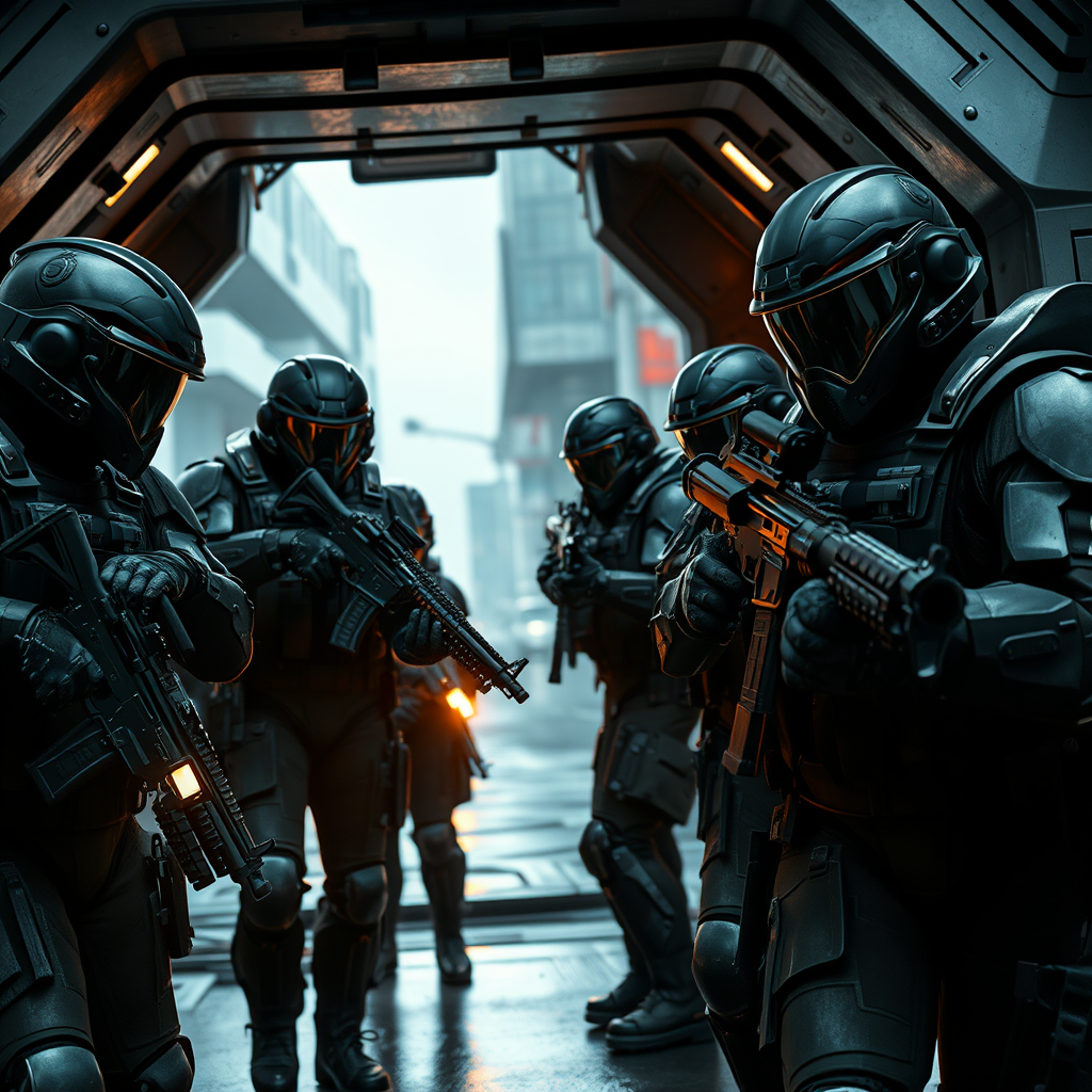 Futuristic soldiers clad in advanced armor, their dark army green suits intricately designed with detailed reflections, stand in formation as they emerge through the ship's hatch. Guns blazing, they maneuver through an overcast city street, the dramatic lighting casting photorealistic shadows on their hyperreal helmets. The cinematic scene captures the soldiers' precise weaponry and helmets in stunning 8k realism, as if rendered in the Unreal Engine. The atmosphere is tense, with the cool, muted colors of an urban battlefield reflecting their resolute focus.