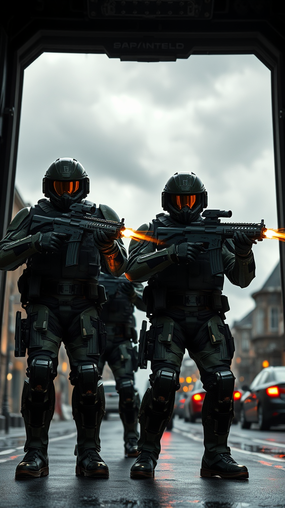 Futuristic soldiers clad in advanced dark army green armor stand poised through the spaceship's hatch, their weapons blazing under an overcast sky. Each soldier's intricate armor features reflective details, showcasing a fine balance of function and aesthetic. The street below catches the dramatic light, emphasizing the soldiers' precise movements. Their helmets are designed with exceptional detail for maximum utility and style. The scene is captured in hyperrealistic, photorealistic quality with a cinematic flair, maximizing depth and intensity in 8k resolution. The ambiance is powered by the Unreal Engine, ensuring a highly immersive and visually stunning representation.
