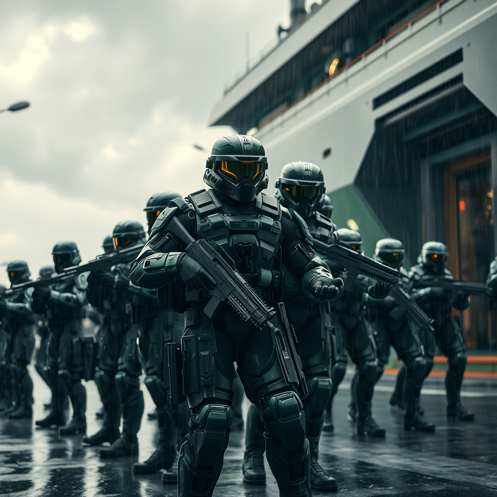 Futuristic soldiers clad in advanced dark army green armor stand in formation at the ship’s entrance, their weapons blazing. The soldiers, equipped with intricately designed helmets and cutting-edge weaponry, create a formidable presence on the rain-slicked street. The overcast sky looms above, casting dramatic lighting that highlights the photorealistic textures and intricate details of their gear. Reflections dance across their armor, enhancing the cinematic feel. The scene is rendered in hyperrealistic 8k resolution using Unreal Engine, capturing every detail of this intense moment.