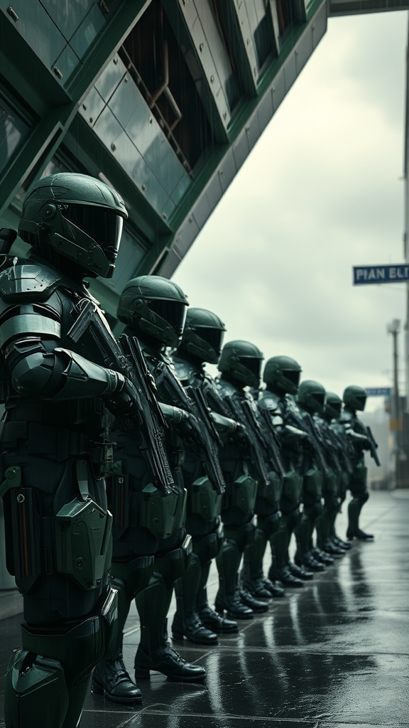 Futuristic soldiers in advanced armor stand in formation through the ship's hatch, their dark army green helmets and weaponry glinting under the overcast sky. The street beneath them is slick with rain, enhancing the dramatic lighting that captures the intricate designs and details of their suits. The soldiers' presence is commanding and hyperrealistic, with a photorealistic quality that makes each element vividly cinematic. The scene resembles something from the unreal engine, shot in 8k, with a palpable tension in the air as reflections dance across their armor.