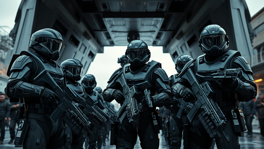 Futuristic soldiers in sleek, advanced armor stand poised at the ship's entryway, weapons drawn, their gear a dark army green that blends seamlessly with the gloomy urban landscape. The overcast sky casts a dramatic, diffused light across the scene, emphasizing the intricate details and reflective surfaces of their helmets and weaponry. Each soldier's uniform exhibits a hyper-realistic, photorealistic quality, reminiscent of a cinematic masterpiece rendered in 8K resolution. The street is alive with tension, as the interplay of shadows and highlights enhances the scene's immersive atmosphere, captured as though within a high-definition virtual realm like an unreal engine visualization.