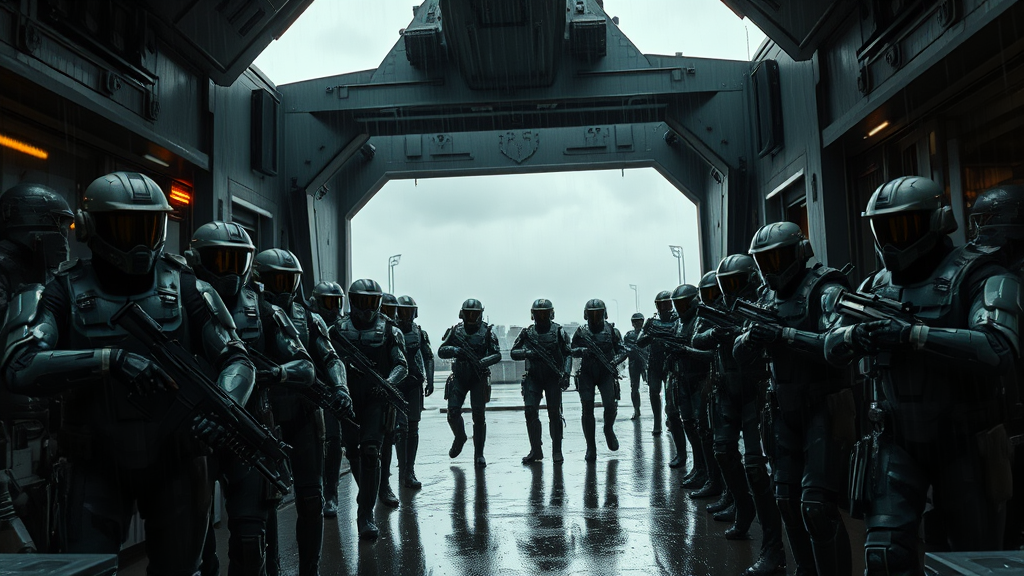 Futuristic soldiers wearing advanced armor, their suits a deep, dark army green, stood in formation as they marched through the ship's open hatch, weapons at the ready, their helmets reflecting the brooding overcast sky. The scene was set on a rain-slicked urban street, with every tiny detail captured in intricate design. The dramatic lighting cast long shadows, highlighting the photorealistic textures and hyperrealism in 8k resolution. The cinematic atmosphere, powered by an unreal engine, captured the intensity of the moment, emphasizing the reflections in the wet surfaces and the power of their presence.