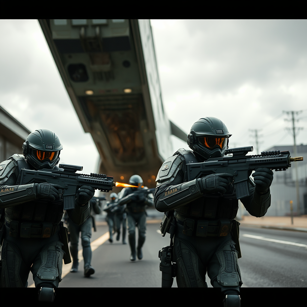 Futuristic soldiers with state-of-the-art armor emerge from the spaceship’s hatch, their weapons firing with precision. The advanced armor and helmets are a deep, dark army green, contrasting against the gray street and overcast skies. Detailed reflection mapping highlights the intricacies of their gear, while dramatic lighting casts shadows, emphasizing their formidable presence. The scene captures a hyperrealistic, photorealistic feel with a cinematic quality, rendered in stunning 8k resolution, like something straight out of an Unreal Engine masterpiece.