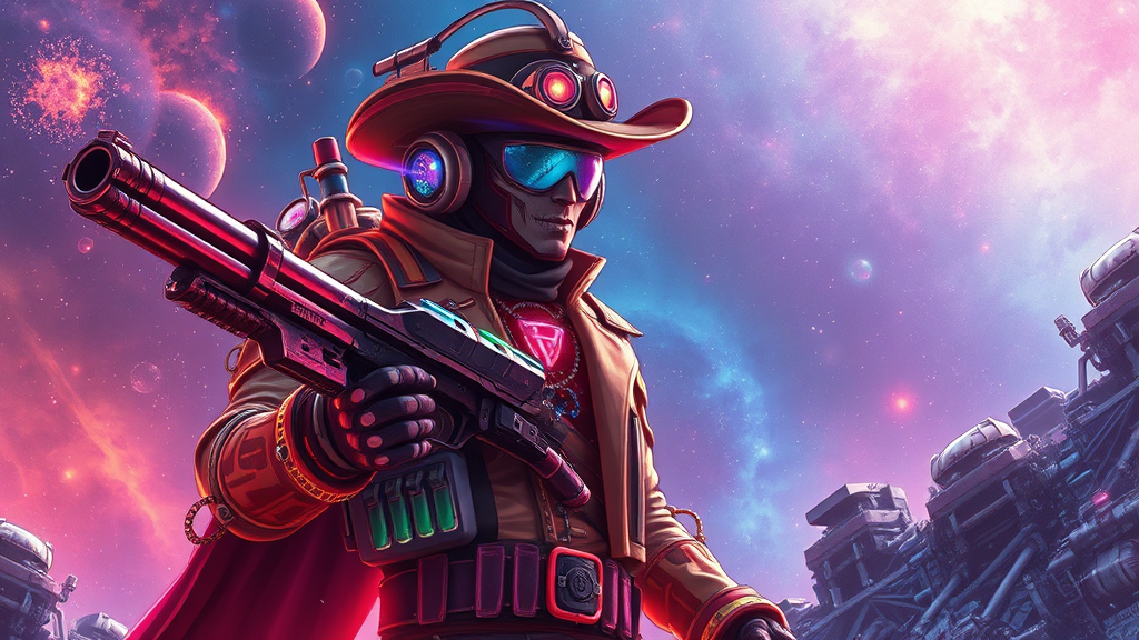 Futuristic space cowboy in a cosmic frontier setting, adorned in detailed space bounty hunter attire with vibrantly colored textures. Equipped with a plasma revolver and cybernetic enhancements, the character boasts high-tech gadgets amidst a breathtaking nebula. This expertly illustrated scene features glowing elements in a dynamic composition, melding sci-fi western and steampunk aesthetics with a Neo-Noir touch. The epic atmosphere of this captivating space opera is rendered with ultra-realistic, 4k detail, seamlessly crossing genres into a cyberpunk-inspired world.