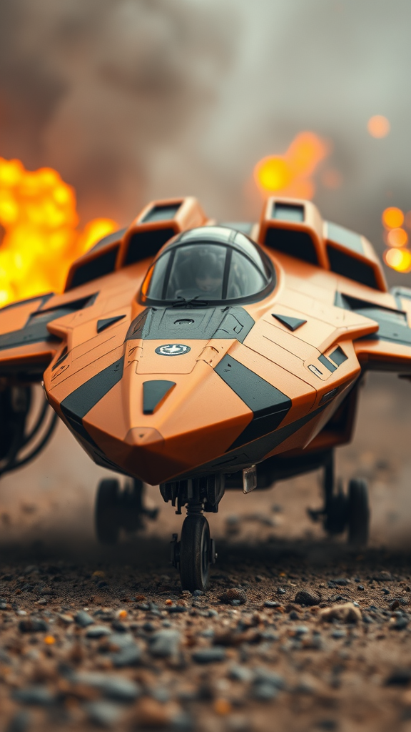 Futuristic space craft inspired by military jet design, featuring metallic orange with matte black and white accents, luxurious and detailed, 8k sharp focus, ultra photorealistic full wide photo shot, set in a Sci-Fi influenced warzone. The craft has wheels touching the ground, amidst blurred background elements suggesting a battlefield environment. Flames and smoke create a dynamic scene around this untamed machine, its appearance reminiscent of a high-end toy or model, similar to a crafted model or collectible, with precision and slight imperfections of a handmade creation.