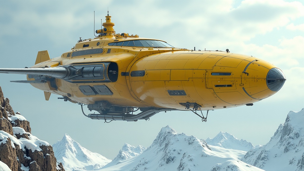 Futuristic spaceship gliding over icy landscapes, hues of yellow and beige, embodying the essence of fantastical ruins and grand architectural scale. Inspired by Viktor Vasnetsov, it features industrial elements and intricate world-building, channeling the artistic style of Dariusz Klimczak. Majestic in appearance, the vessel is captured in high definition with exceptional detail, a true masterpiece of design. It floats above snowy peaks, maintaining its yellow and beige coloration, presenting detailed architectural scenes with accents of rusty debris and imposing monumentality. The craftsmanship evokes the works of Leszek Bujnowski and echoes Alexei Harlamoff’s fusion of modular construction, delivering a highly detailed, high-definition masterpiece.