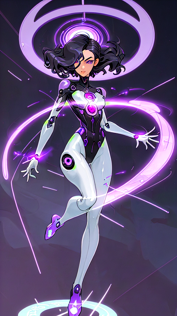Futuristic supervillain. Cyberpunk, Scanners. Telepath, telekinetic, brain waves, mind powers. Caucasian feminine woman. Tall, thin, athletic, fit. Short length black hair with a purple Sheen, in a spiky choppy swept up and swept style, hair flipped over one eye. Beautiful pale skin with sculptured brows and opal eyes. Her eyes are hidden behind Violet colored futuristic goggles. Strong cheekbones, delicate chin. Shiny silver full bodysuit (full body coverage) with lavender tech and circuitry patterns on the arms, legs, and chest. High heeled knee-high boots with the same kinds of patterns. There is a circle of purple, Violet, lavender, pink and white sparks/energy flying forth from around her head, signifying her telepathic powers. Full body pose, she is levitating off the ground.